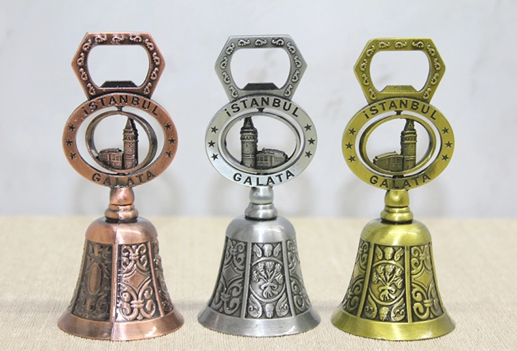 AÇACAKLI GALATA TEMALI EL ÇANIÜrün ÖzellikleriAçacaklı Galata Temalı El Çanı, kompakt tasarımı ve fonksiyonel yapısıyla hem dekoratif hem de pratik kullanım sunan özel bir üründür. 8 cm boyutundaki yapısı sayesinde masaüstü, raf ve vitrin dekorasyonunda zarif bir görünüm oluşturur. Üzerinde yer alan Galata temalı detaylar ürüne turistik ve koleksiyonluk bir karakter kazandırır. Alt kısmında bulunan açacak fonksiyonu sayesinde yalnızca dekoratif değil, aynı zamanda günlük kullanım için de avantaj sağlar. Metal gövde yapısı sağlam ve estetik bir duruş sunar. Gönderim sırasında görselde yer alan renklerden biri karışık olarak gönderilmektedir. Küçük boyutuyla pratik kullanım sunan bir açacaklı el çanı modelidir. Şehir simgeli tasarımıyla dikkat çeken dekoratif bir Galata temalı metal çan alternatifidir.Ürün Teknik ÖzellikleriÖzellikAçıklamaÜrün AdıAçacaklı Galata Temalı El ÇanıBoyut8 cmMalzemeMetalÖzellikAçacak FonksiyonluTemaGalata TasarımıRenkGörseldeki Renklerden Biri Karışık Olarak GönderilirKullanım AlanıDekoratif ve Açacak Amaçlı KullanımPaket İçeriği1 Adet Açacaklı Galata Temalı El Çanı