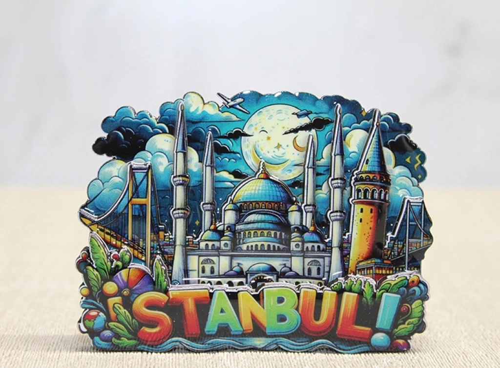 AHŞAP İSTANBUL TEMALI MAGNET - MODEL 2Ürün ÖzellikleriAhşap İstanbul Temalı Magnet - Model 2, İstanbul silüetini ve simgesel yapı detaylarını katmanlı tasarım formuyla bir araya getiren dekoratif bir hatıra ürünüdür. 9,5x9 cm ölçüsündeki kompakt yapısı sayesinde buzdolabı ve metal yüzeylerde dengeli ve dikkat çekici bir görünüm sunar. Ahşap malzemeden üretilmiş gövdesi doğal bir doku oluştururken, renkli şehir figürleri ve “Istanbul” yazı detayı ürüne turistik ve koleksiyonluk bir karakter kazandırır. Katmanlı kesim yapısı üç boyutlu bir görünüm etkisi oluşturarak klasik düz magnet modellerine göre daha estetik bir duruş sağlar. Ev ve ofis ortamlarında dekoratif kullanım için uygundur. Şehir konseptiyle öne çıkan bir ahşap İstanbul temalı magnet modelidir. Renkli ve detaylı tasarımıyla dikkat çeken bir dekoratif buzdolabı magneti alternatifidir.Ürün Teknik ÖzellikleriÖzellikAçıklamaÜrün AdıAhşap İstanbul Temalı Magnet - Model 2Boyut9,5 x 9 cmMalzemeAhşapTasarımKatmanlı İstanbul Silüeti ve Yazı DetayıKullanım AlanıBuzdolabı ve Metal YüzeylerPaket İçeriği1 Adet Ahşap İstanbul Temalı Magnet - Model 2