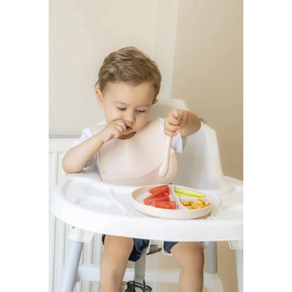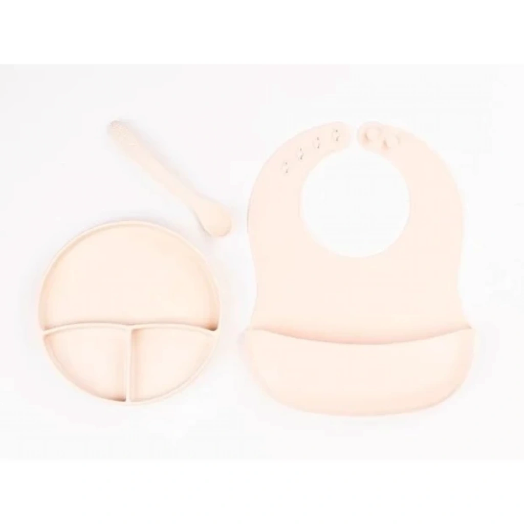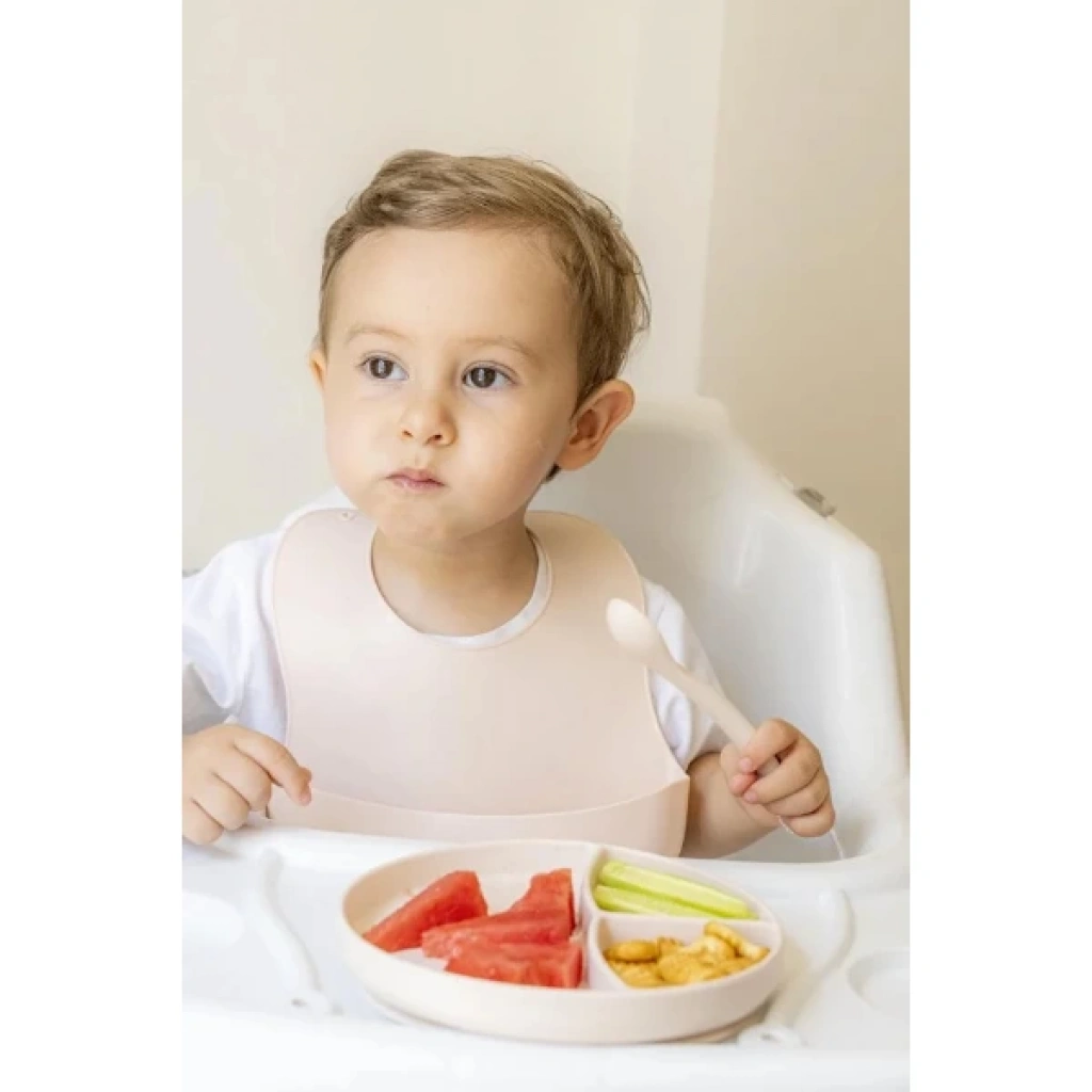 Krem Rengi 3’lü Silikon Yemek Seti – Önlük + Diş Kaşıyıcılı Kaşık + Vakumlu Tabak