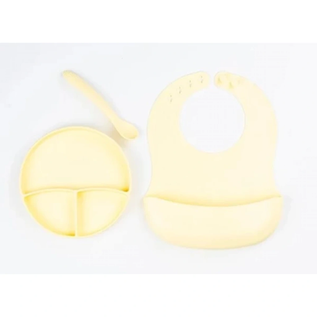 Sarı 3’lü Silikon Yemek Seti – Önlük + Diş Kaşıyıcılı Kaşık + Vakumlu Tabak