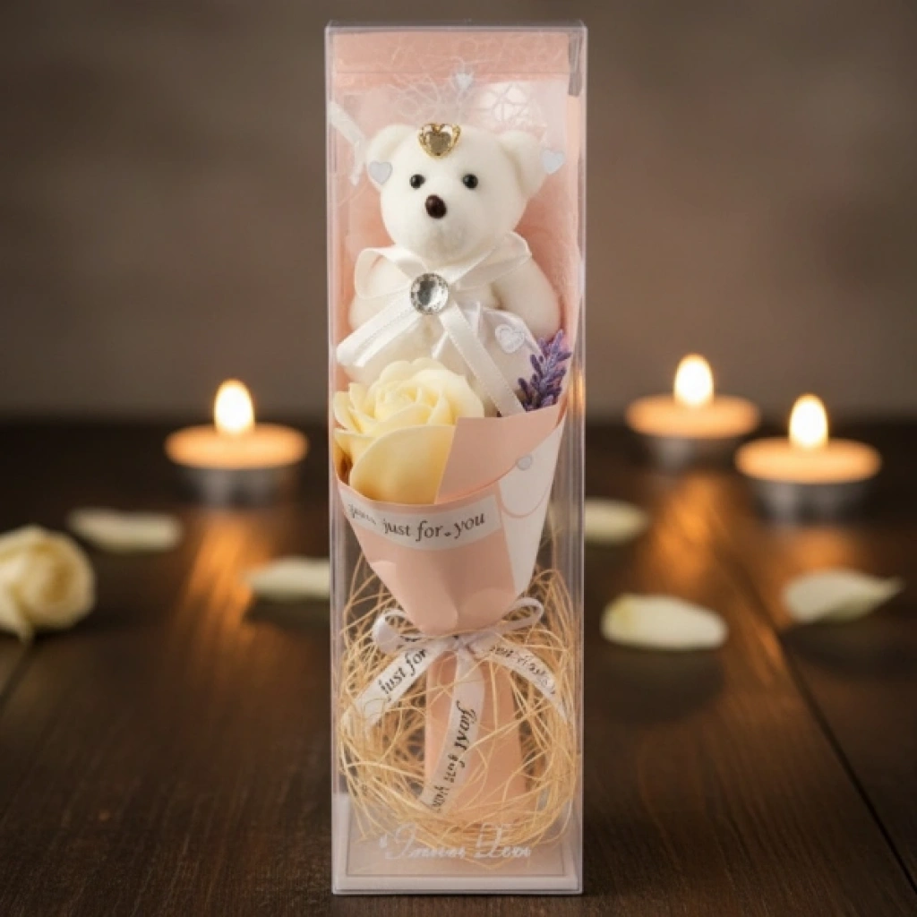 Şeffaf Kutulu Ayıcıklı Gül Buketi