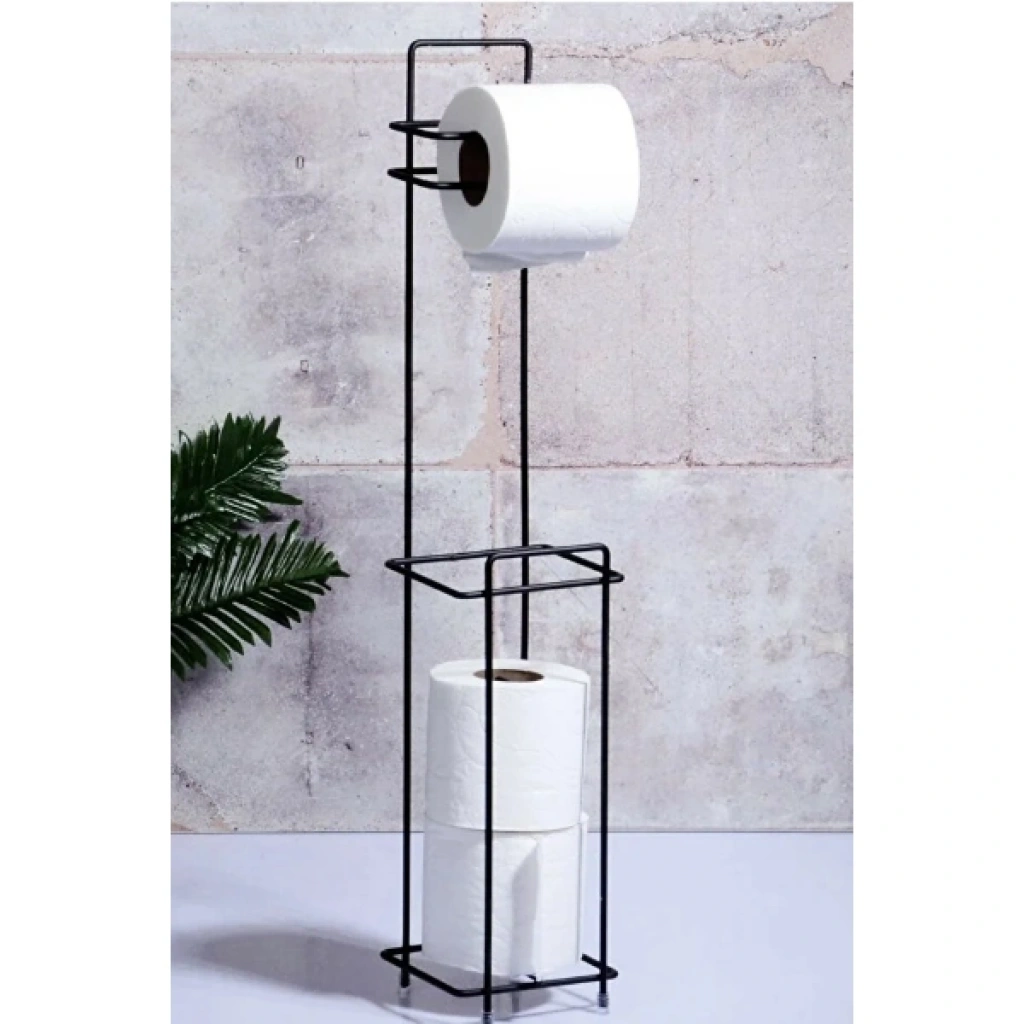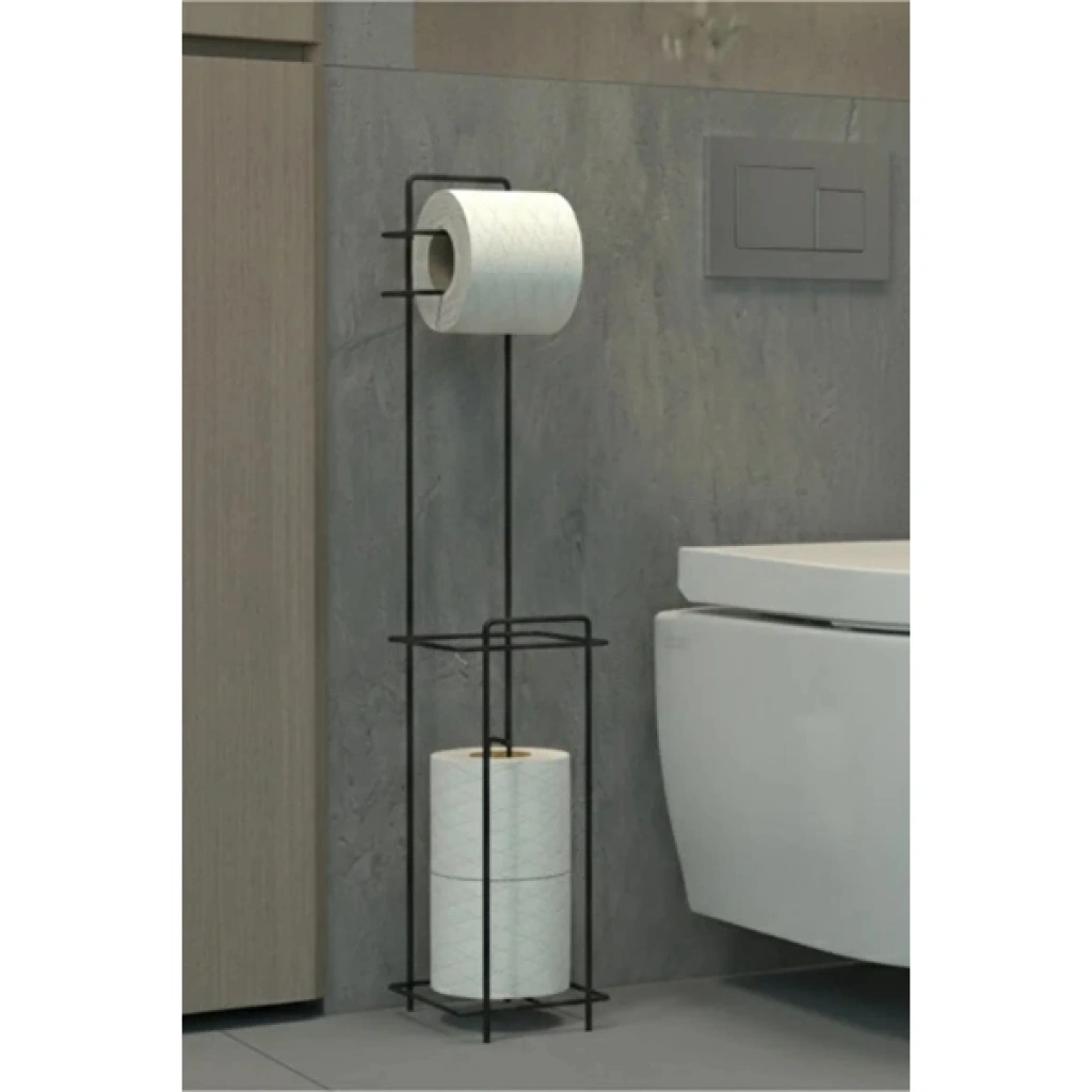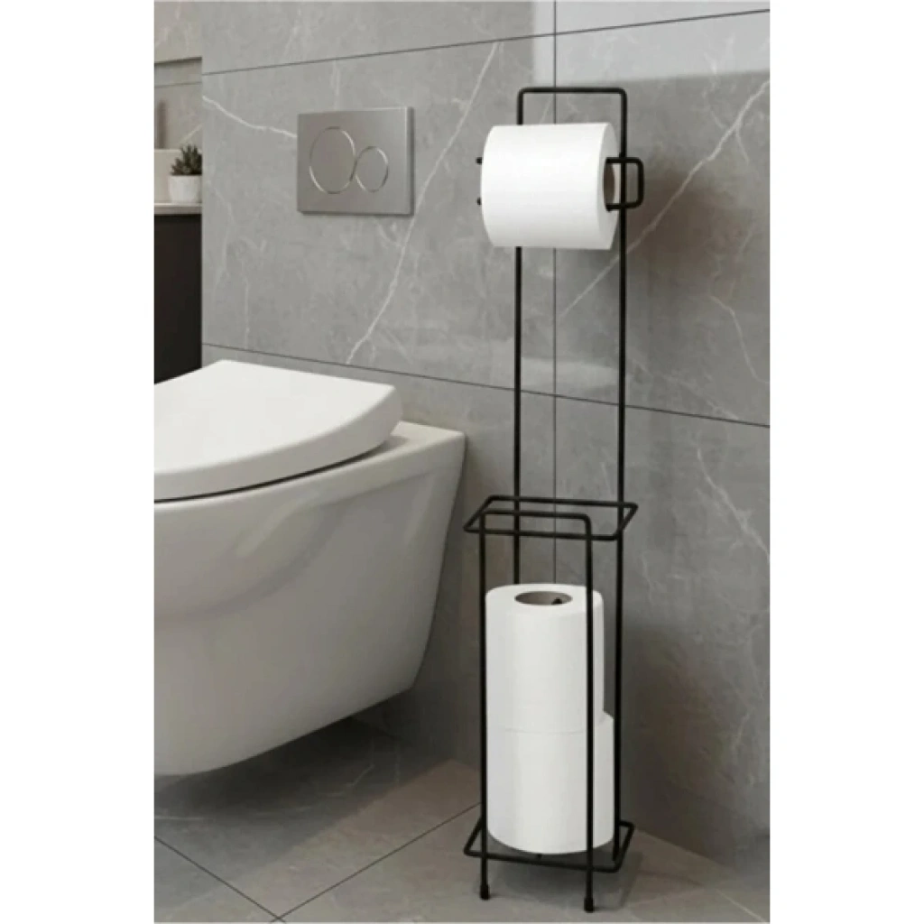 SİYAH STANDLI YEDEK HAZNELİ TUVALET KAĞITLIĞIÜrün ÖzellikleriSiyah standlı yedek hazneli tuvalet kağıtlığı, banyo ve tuvalet alanlarında hem düzen hem de estetik görünüm arayan kullanıcılar için özel olarak tasarlanmıştır. Modern ve sade çizgilere sahip standlı tuvalet kağıtlığı tasarımı, duvar delmeye veya montaj işlemlerine ihtiyaç duymadan zemine yerleştirilerek pratik kullanım sunar. Üst bölümde aktif kullanım için tuvalet kağıdı askısı bulunurken, alt kısımda yer alan yedek hazneli kağıtlık alanı sayesinde ekstra rulolar düzenli şekilde muhafaza edilir. Dayanıklı metal gövdesi uzun ömürlü kullanım sağlarken, siyah elektrostatik kaplaması sayesinde paslanmaya karşı direnç gösterir. Minimal yapısı sayesinde dar alanlarda bile rahatlıkla kullanılabilen ürün, banyo dekorasyonuna modern ve şık bir dokunuş katar. Hem ev hem de ofis kullanımına uygun olan çok amaçlı banyo düzenleyici, fonksiyonelliği ve estetik duruşu bir arada sunar.Ürün Teknik Özellikleri Özellik Açıklama Ürün Adı Siyah Standlı Yedek Hazneli Tuvalet Kağıtlığı Malzeme Dayanıklı metal Renk Siyah Yapı Standlı, zemine yerleştirilebilir Yedek Hazne Alt bölmede yedek rulo saklama alanı Montaj Montajsız, delme gerektirmez Kullanım Alanı Banyo, tuvalet, ofis Kullanım Amacı Düzenleme ve pratik kullanım Paket İçeriği1 adet siyah standlı yedek hazneli tuvalet kağıtlığı